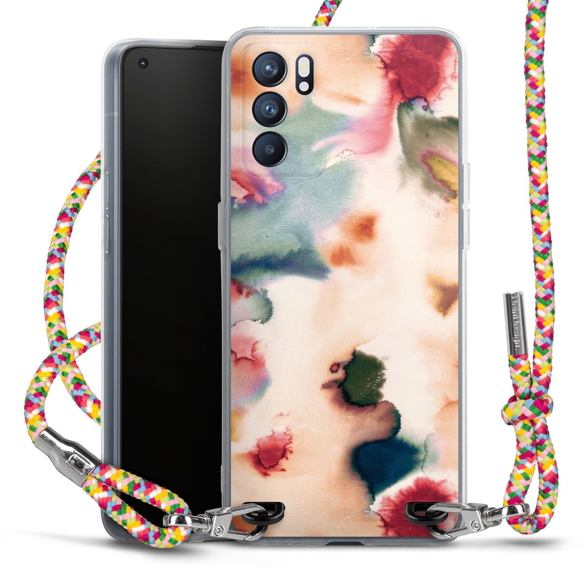 The flexible case is made from a highquality TPU material (thermoplastic Polyurethan). Thanks to its longlasting and break resistant characterisitcs, the case is flexible yet consistent in form and has a great grip and feel. The textile strap made from Polyester gives a chic yet casual accent allowing you to carry your phone like a bag or necklace - a practical gadget perfect for your next adventure. The textile strap is about 1.70 meters long and the length can easily be adjusted through the knots. Our Carry Case is available in Colourful, Mint-Camouflage, Very-Berry, Sahara-Sand and Sparkling-Neon. The ends of the textile strap are covered with metallic end caps to protect them against fraying.