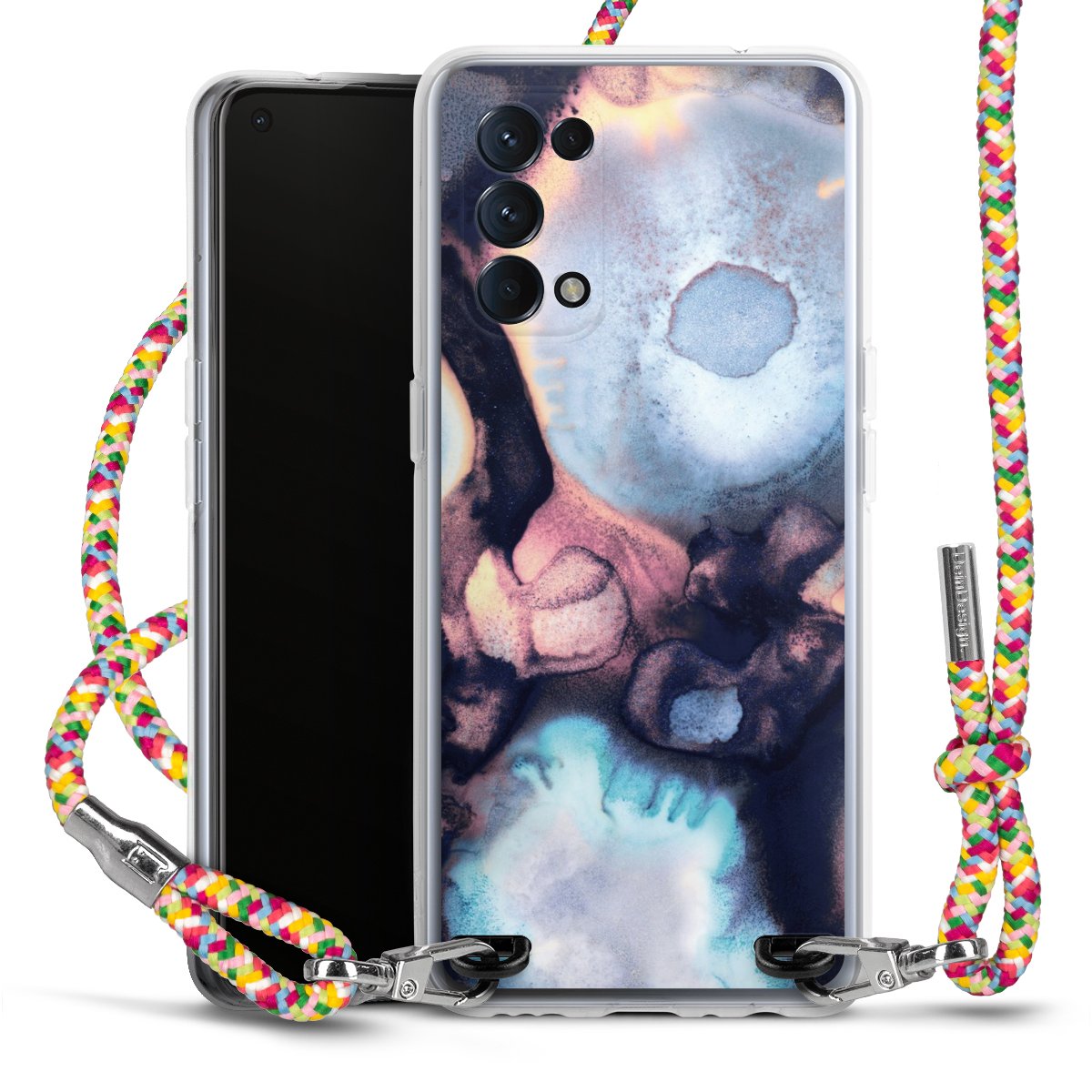 The flexible case is made from a highquality TPU material (thermoplastic Polyurethan). Thanks to its longlasting and break resistant characterisitcs, the case is flexible yet consistent in form and has a great grip and feel. The textile strap made from Polyester gives a chic yet casual accent allowing you to carry your phone like a bag or necklace - a practical gadget perfect for your next adventure. The textile strap is about 1.70 meters long and the length can easily be adjusted through the knots. Our Carry Case is available in Colourful, Mint-Camouflage, Very-Berry, Sahara-Sand and Sparkling-Neon. The ends of the textile strap are covered with metallic end caps to protect them against fraying.