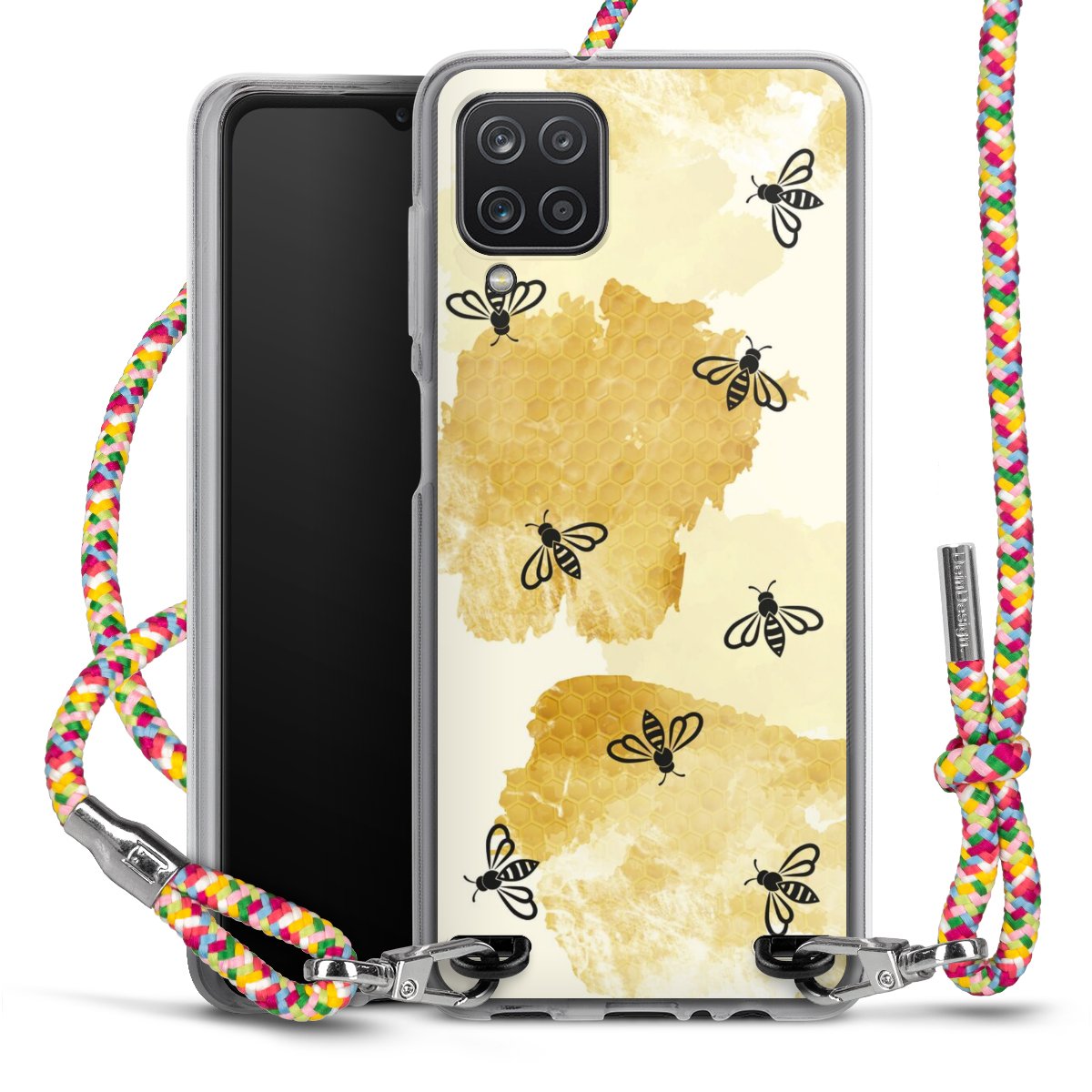 The flexible case is made from a highquality TPU material (thermoplastic Polyurethan). Thanks to its longlasting and break resistant characterisitcs, the case is flexible yet consistent in form and has a great grip and feel. The textile strap made from Polyester gives a chic yet casual accent allowing you to carry your phone like a bag or necklace - a practical gadget perfect for your next adventure. The textile strap is about 1.70 meters long and the length can easily be adjusted through the knots. Our Carry Case is available in Colourful, Mint-Camouflage, Very-Berry, Sahara-Sand and Sparkling-Neon. The ends of the textile strap are covered with metallic end caps to protect them against fraying.