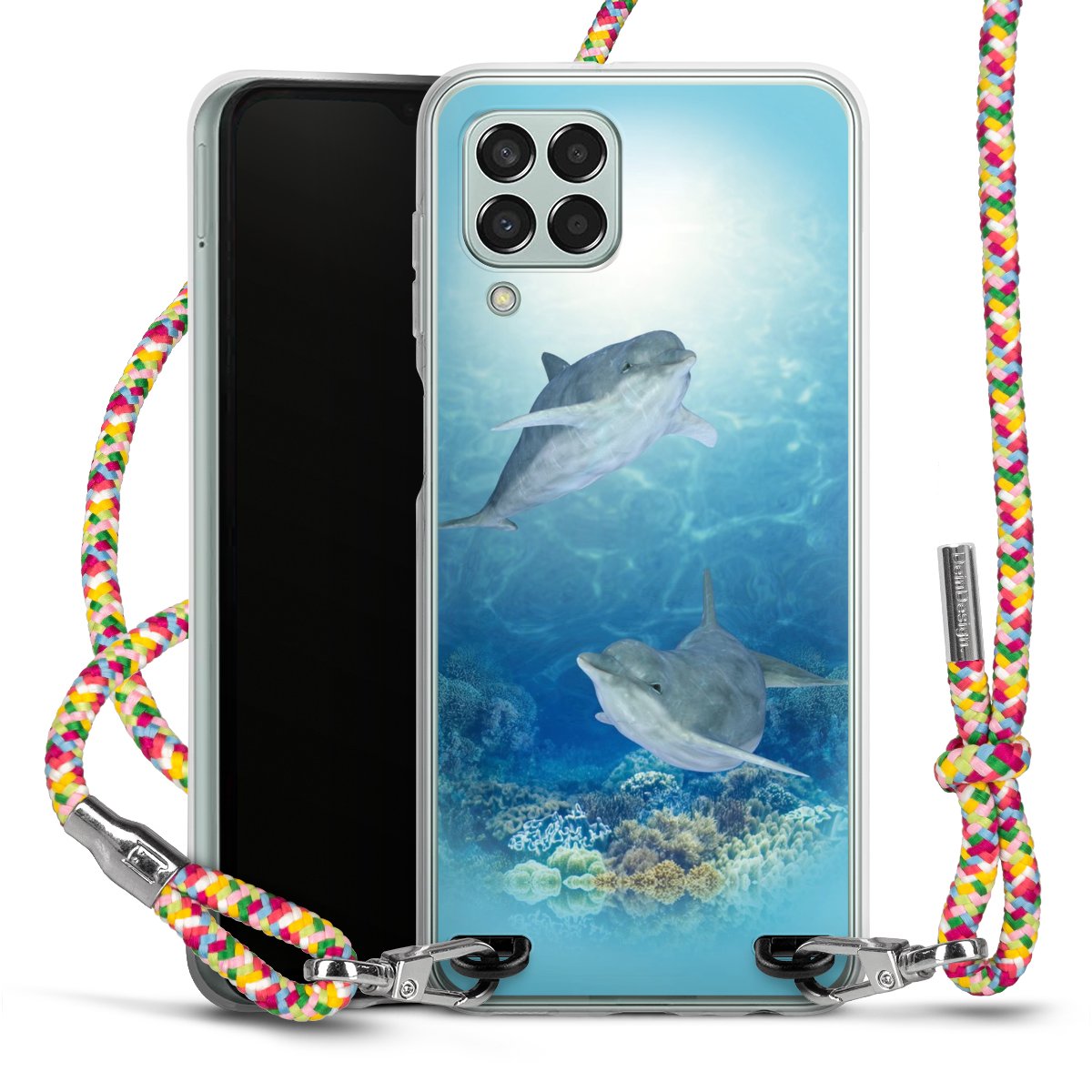The flexible case is made from a highquality TPU material (thermoplastic Polyurethan). Thanks to its longlasting and break resistant characterisitcs, the case is flexible yet consistent in form and has a great grip and feel. The textile strap made from Polyester gives a chic yet casual accent allowing you to carry your phone like a bag or necklace - a practical gadget perfect for your next adventure. The textile strap is about 1.70 meters long and the length can easily be adjusted through the knots. Our Carry Case is available in Colourful, Mint-Camouflage, Very-Berry, Sahara-Sand and Sparkling-Neon. The ends of the textile strap are covered with metallic end caps to protect them against fraying.