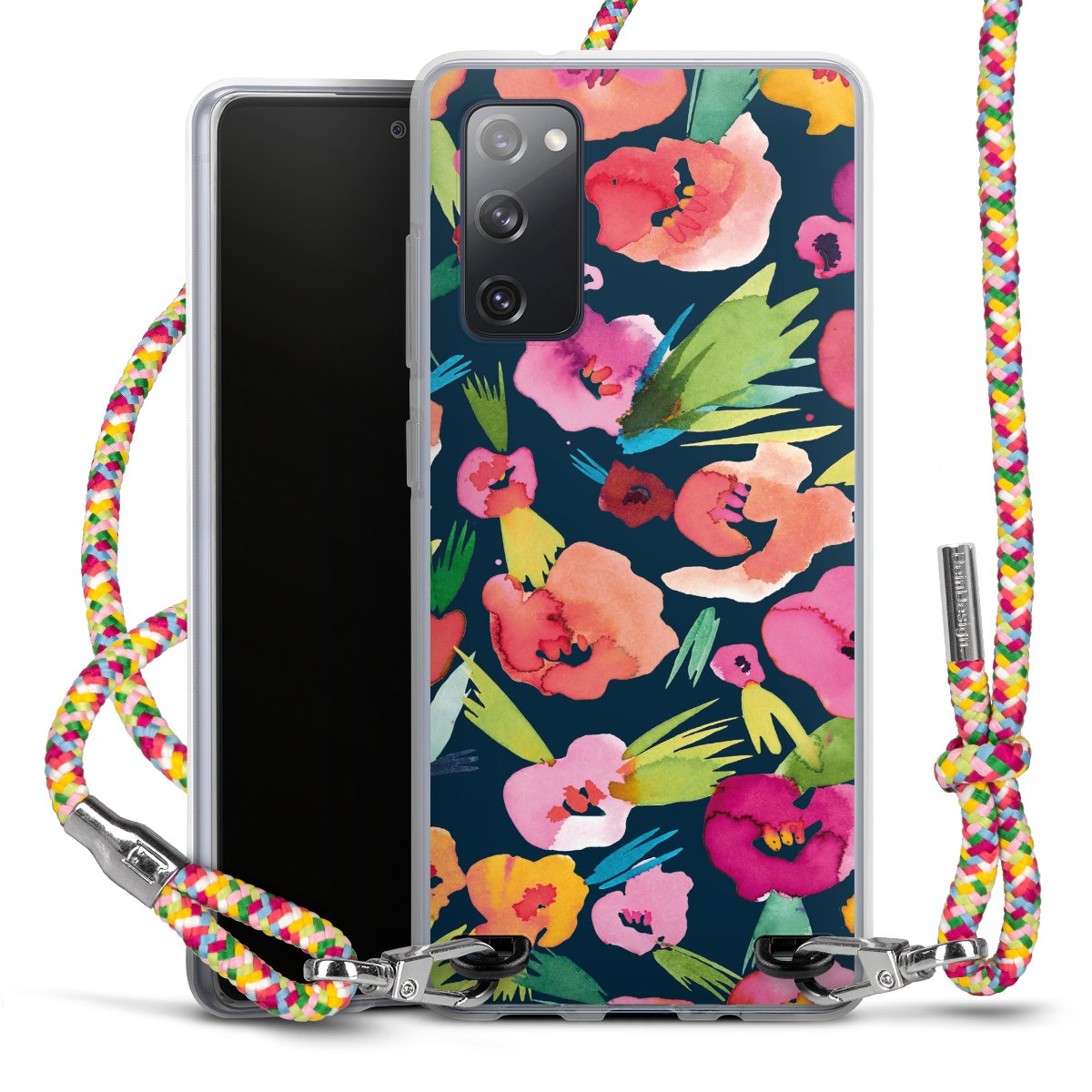 The flexible case is made from a highquality TPU material (thermoplastic Polyurethan). Thanks to its longlasting and break resistant characterisitcs, the case is flexible yet consistent in form and has a great grip and feel. The textile strap made from Polyester gives a chic yet casual accent allowing you to carry your phone like a bag or necklace - a practical gadget perfect for your next adventure. The textile strap is about 1.70 meters long and the length can easily be adjusted through the knots. Our Carry Case is available in Colourful, Mint-Camouflage, Very-Berry, Sahara-Sand and Sparkling-Neon. The ends of the textile strap are covered with metallic end caps to protect them against fraying.