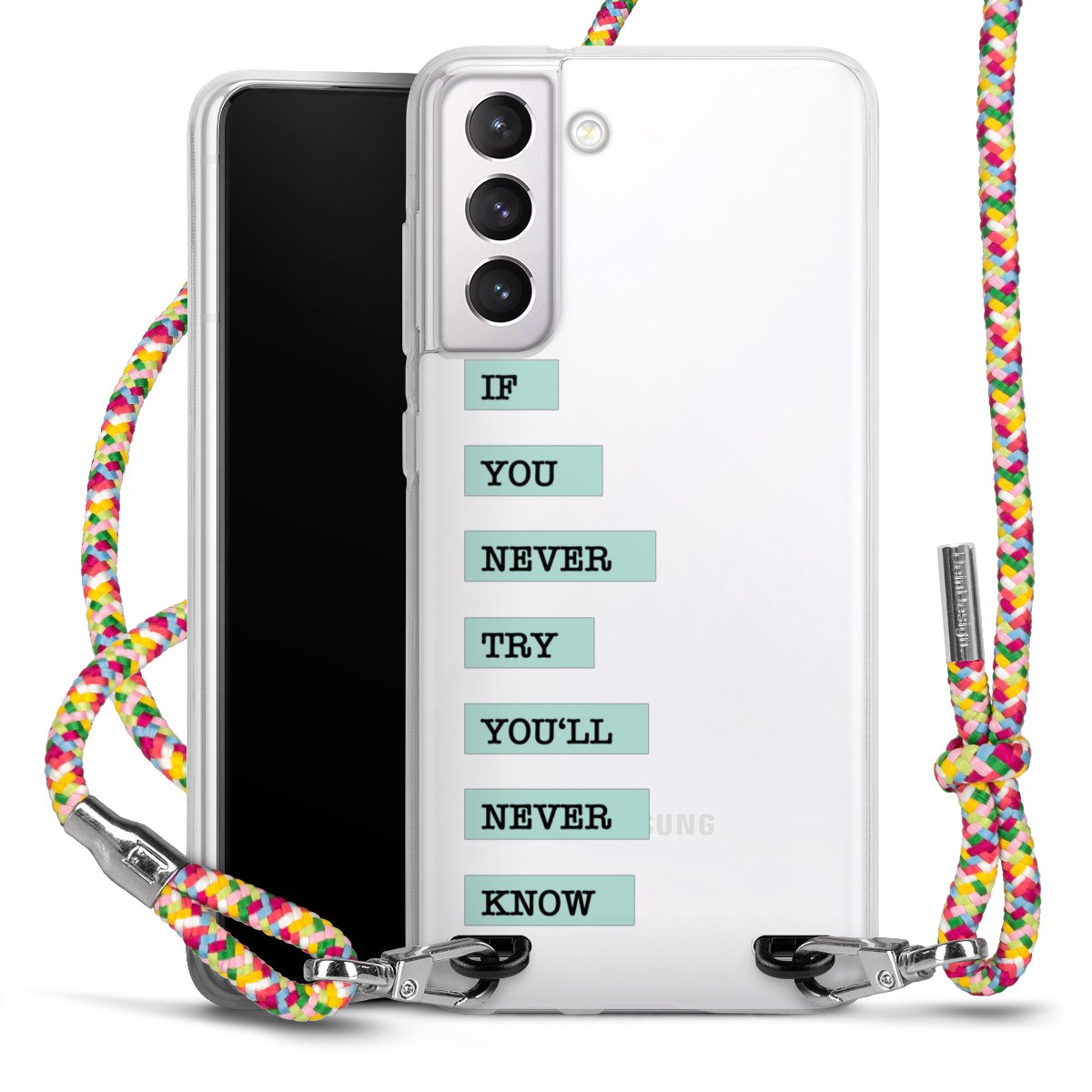 The flexible case is made from a highquality TPU material (thermoplastic Polyurethan). Thanks to its longlasting and break resistant characterisitcs, the case is flexible yet consistent in form and has a great grip and feel. The textile strap made from Polyester gives a chic yet casual accent allowing you to carry your phone like a bag or necklace - a practical gadget perfect for your next adventure. The textile strap is about 1.70 meters long and the length can easily be adjusted through the knots. Our Carry Case is available in Colourful, Mint-Camouflage, Very-Berry, Sahara-Sand and Sparkling-Neon. The ends of the textile strap are covered with metallic end caps to protect them against fraying.