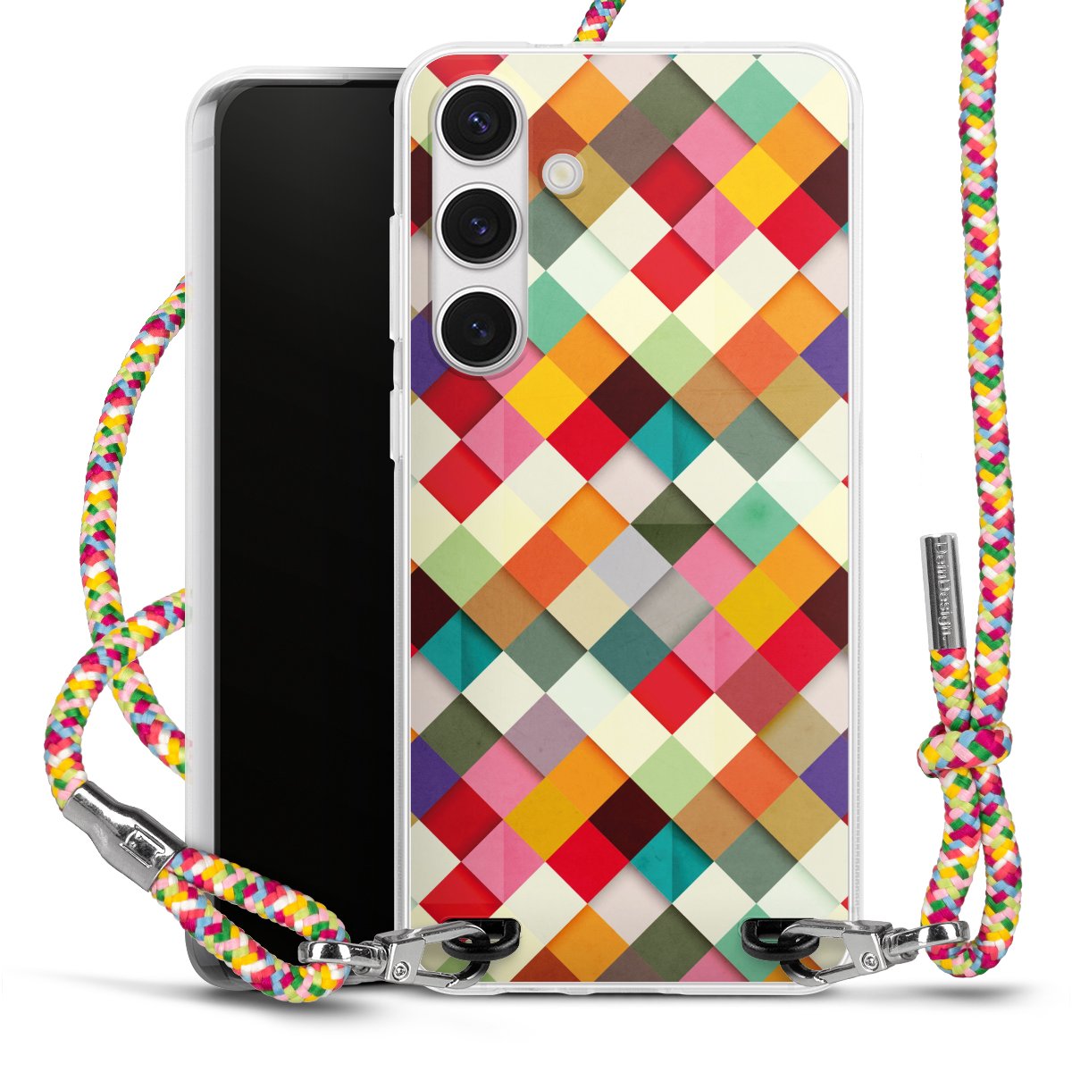The flexible case is made from a highquality TPU material (thermoplastic Polyurethan). Thanks to its longlasting and break resistant characterisitcs, the case is flexible yet consistent in form and has a great grip and feel. The textile strap made from Polyester gives a chic yet casual accent allowing you to carry your phone like a bag or necklace - a practical gadget perfect for your next adventure. The textile strap is about 1.70 meters long and the length can easily be adjusted through the knots. Our Carry Case is available in Colourful, Mint-Camouflage, Very-Berry, Sahara-Sand and Sparkling-Neon. The ends of the textile strap are covered with metallic end caps to protect them against fraying.