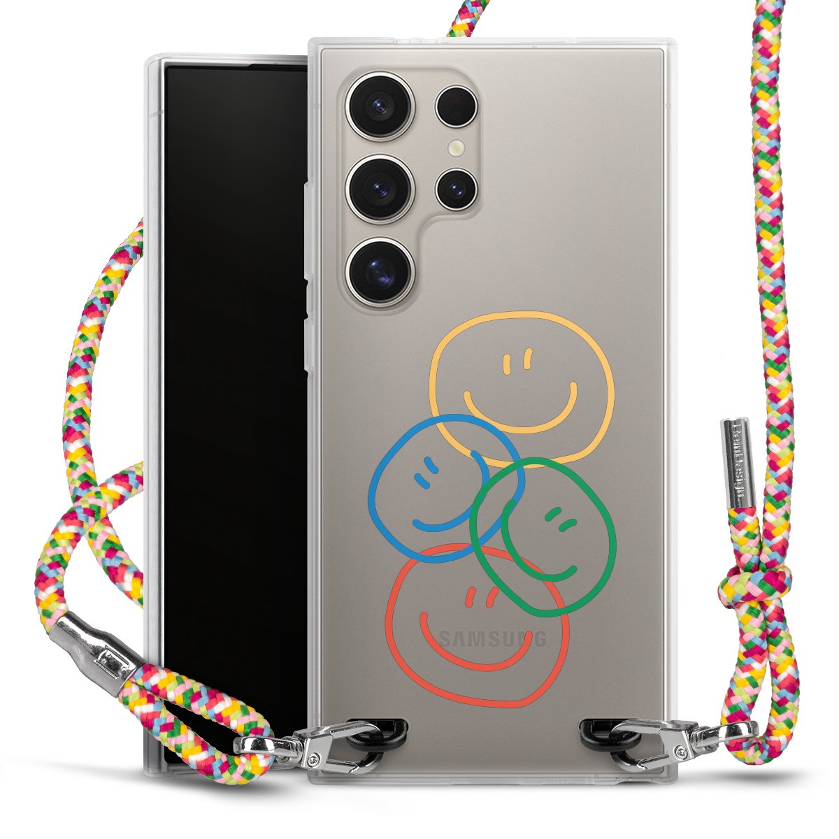 The flexible case is made from a highquality TPU material (thermoplastic Polyurethan). Thanks to its longlasting and break resistant characterisitcs, the case is flexible yet consistent in form and has a great grip and feel. The textile strap made from Polyester gives a chic yet casual accent allowing you to carry your phone like a bag or necklace - a practical gadget perfect for your next adventure. The textile strap is about 1.70 meters long and the length can easily be adjusted through the knots. Our Carry Case is available in Colourful, Mint-Camouflage, Very-Berry, Sahara-Sand and Sparkling-Neon. The ends of the textile strap are covered with metallic end caps to protect them against fraying.