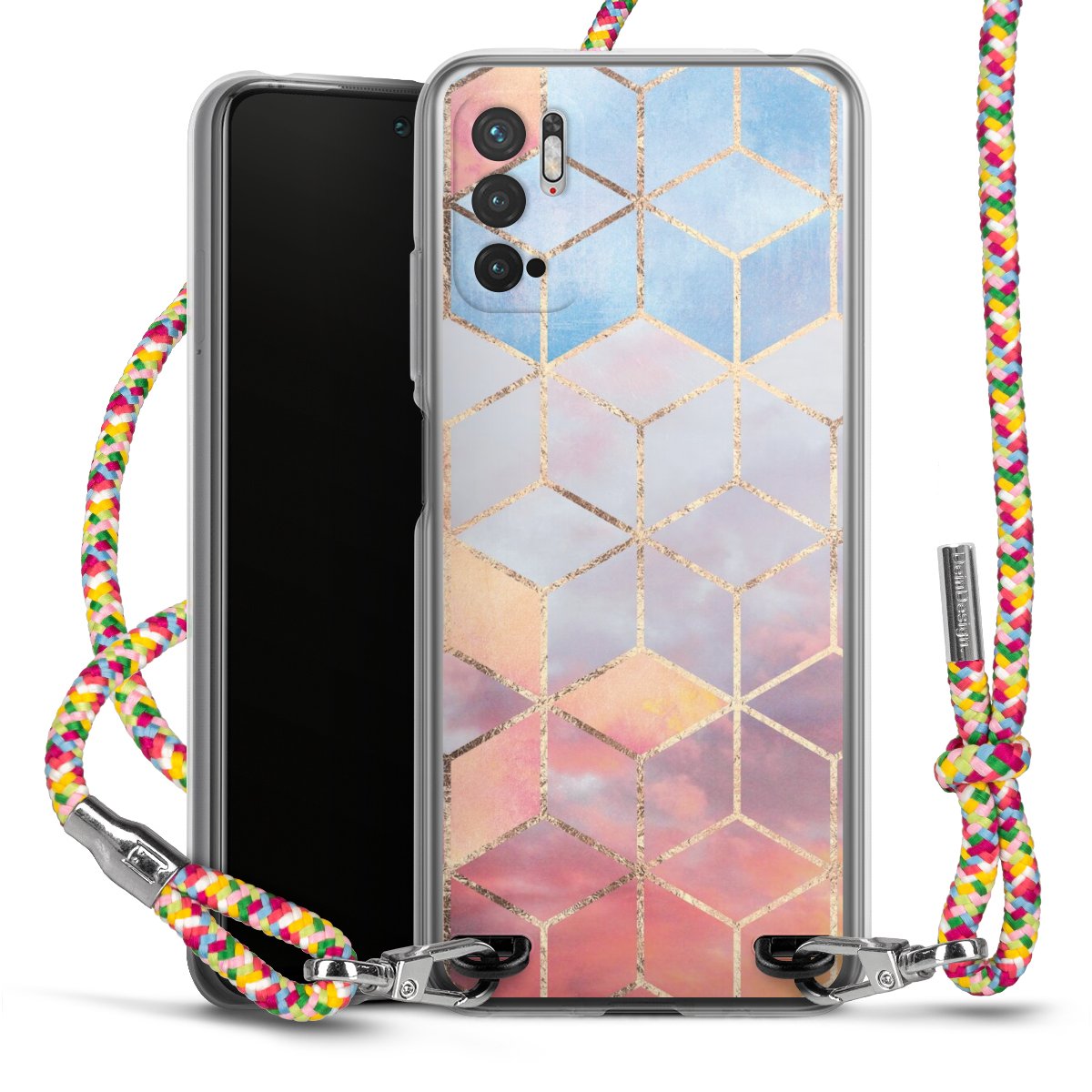 The flexible case is made from a highquality TPU material (thermoplastic Polyurethan). Thanks to its longlasting and break resistant characterisitcs, the case is flexible yet consistent in form and has a great grip and feel. The textile strap made from Polyester gives a chic yet casual accent allowing you to carry your phone like a bag or necklace - a practical gadget perfect for your next adventure. The textile strap is about 1.70 meters long and the length can easily be adjusted through the knots. Our Carry Case is available in Colourful, Mint-Camouflage, Very-Berry, Sahara-Sand and Sparkling-Neon. The ends of the textile strap are covered with metallic end caps to protect them against fraying.