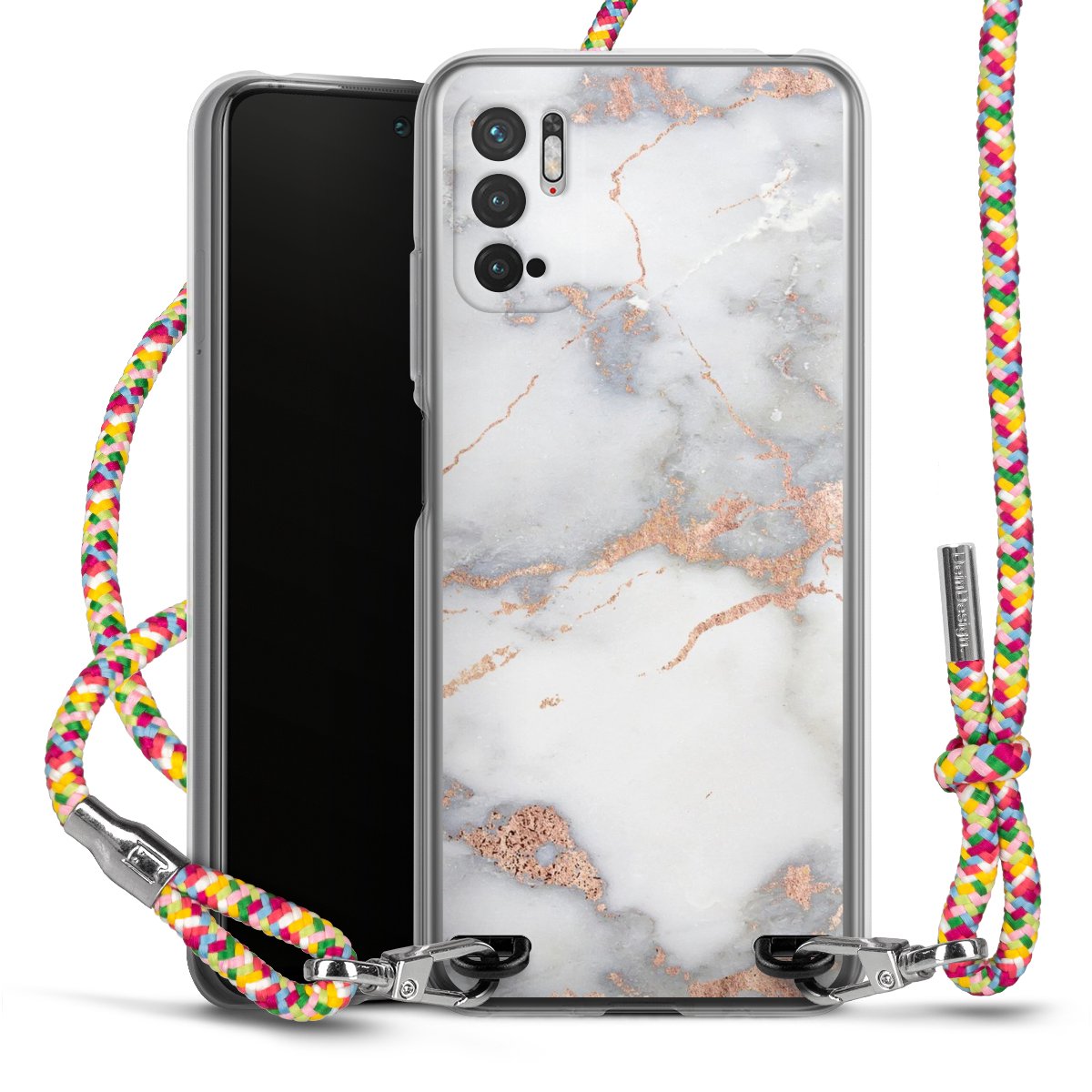 The flexible case is made from a highquality TPU material (thermoplastic Polyurethan). Thanks to its longlasting and break resistant characterisitcs, the case is flexible yet consistent in form and has a great grip and feel. The textile strap made from Polyester gives a chic yet casual accent allowing you to carry your phone like a bag or necklace - a practical gadget perfect for your next adventure. The textile strap is about 1.70 meters long and the length can easily be adjusted through the knots. Our Carry Case is available in Colourful, Mint-Camouflage, Very-Berry, Sahara-Sand and Sparkling-Neon. The ends of the textile strap are covered with metallic end caps to protect them against fraying.