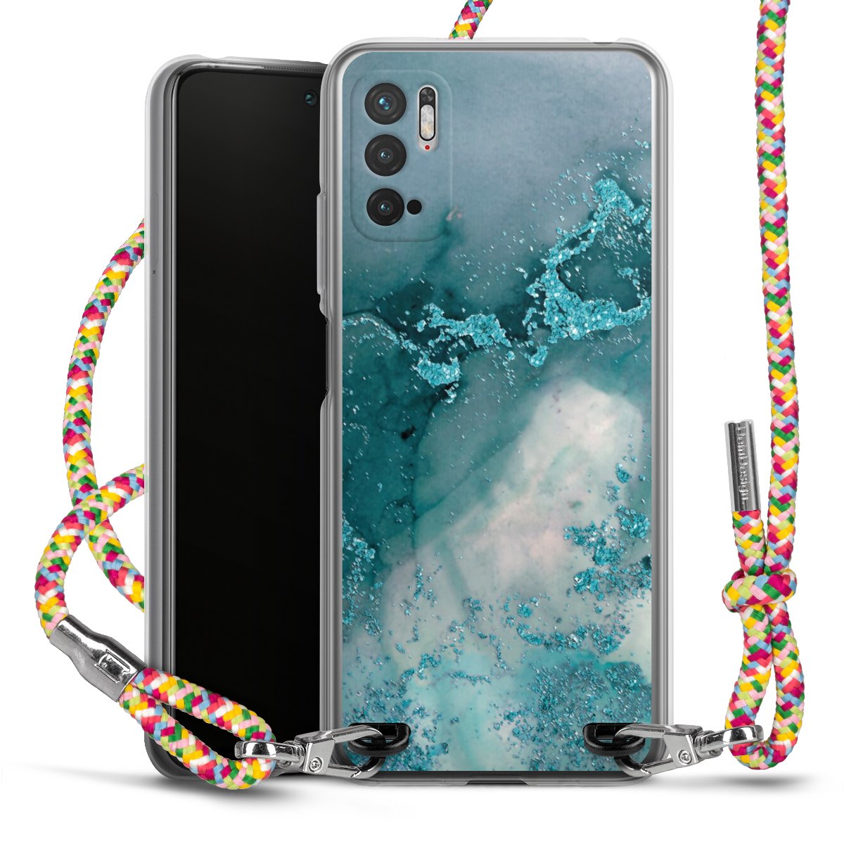 The flexible case is made from a highquality TPU material (thermoplastic Polyurethan). Thanks to its longlasting and break resistant characterisitcs, the case is flexible yet consistent in form and has a great grip and feel. The textile strap made from Polyester gives a chic yet casual accent allowing you to carry your phone like a bag or necklace - a practical gadget perfect for your next adventure. The textile strap is about 1.70 meters long and the length can easily be adjusted through the knots. Our Carry Case is available in Colourful, Mint-Camouflage, Very-Berry, Sahara-Sand and Sparkling-Neon. The ends of the textile strap are covered with metallic end caps to protect them against fraying.