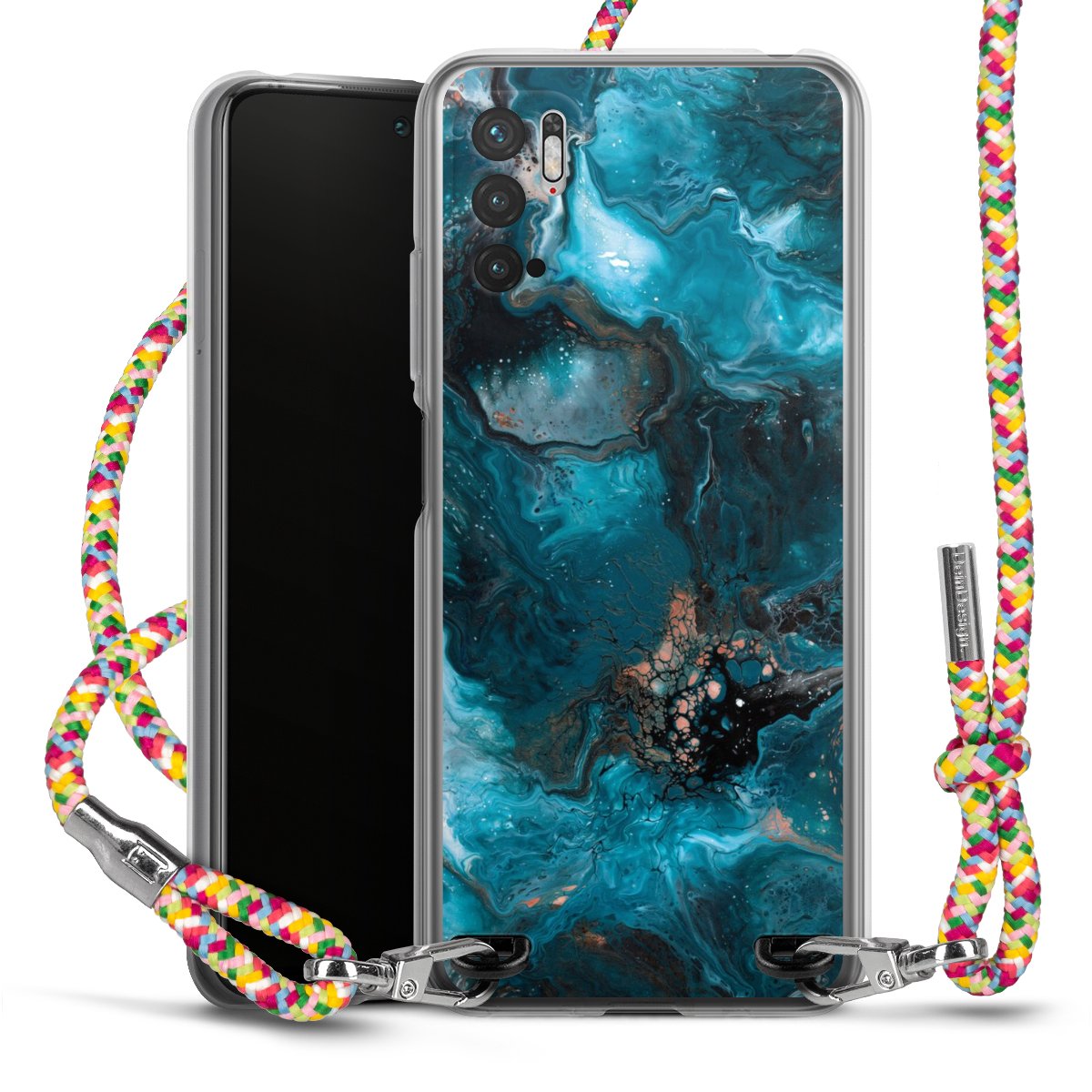 The flexible case is made from a highquality TPU material (thermoplastic Polyurethan). Thanks to its longlasting and break resistant characterisitcs, the case is flexible yet consistent in form and has a great grip and feel. The textile strap made from Polyester gives a chic yet casual accent allowing you to carry your phone like a bag or necklace - a practical gadget perfect for your next adventure. The textile strap is about 1.70 meters long and the length can easily be adjusted through the knots. Our Carry Case is available in Colourful, Mint-Camouflage, Very-Berry, Sahara-Sand and Sparkling-Neon. The ends of the textile strap are covered with metallic end caps to protect them against fraying.
