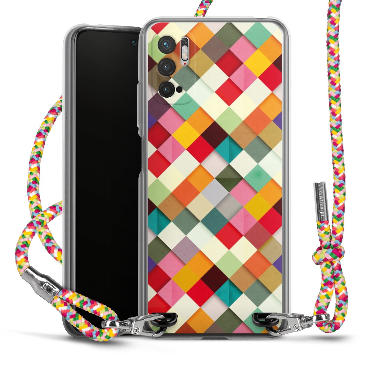 The flexible case is made from a highquality TPU material (thermoplastic Polyurethan). Thanks to its longlasting and break resistant characterisitcs, the case is flexible yet consistent in form and has a great grip and feel. The textile strap made from Polyester gives a chic yet casual accent allowing you to carry your phone like a bag or necklace - a practical gadget perfect for your next adventure. The textile strap is about 1.70 meters long and the length can easily be adjusted through the knots. Our Carry Case is available in Colourful, Mint-Camouflage, Very-Berry, Sahara-Sand and Sparkling-Neon. The ends of the textile strap are covered with metallic end caps to protect them against fraying.