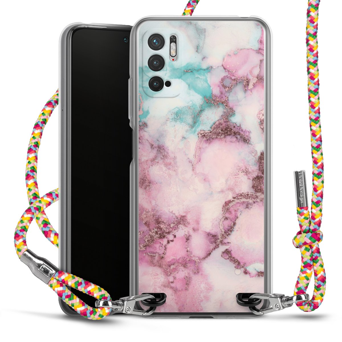 The flexible case is made from a highquality TPU material (thermoplastic Polyurethan). Thanks to its longlasting and break resistant characterisitcs, the case is flexible yet consistent in form and has a great grip and feel. The textile strap made from Polyester gives a chic yet casual accent allowing you to carry your phone like a bag or necklace - a practical gadget perfect for your next adventure. The textile strap is about 1.70 meters long and the length can easily be adjusted through the knots. Our Carry Case is available in Colourful, Mint-Camouflage, Very-Berry, Sahara-Sand and Sparkling-Neon. The ends of the textile strap are covered with metallic end caps to protect them against fraying.