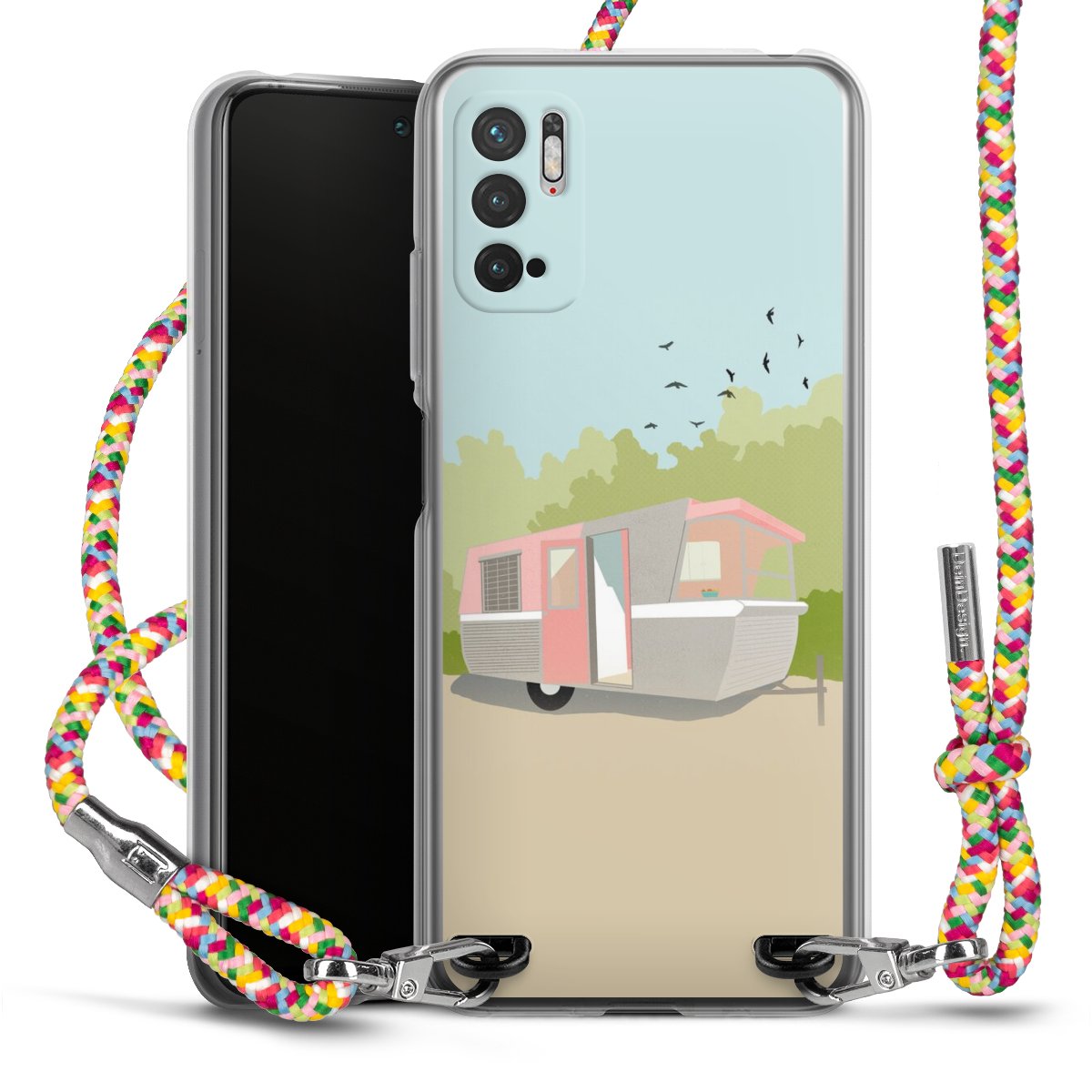 The flexible case is made from a highquality TPU material (thermoplastic Polyurethan). Thanks to its longlasting and break resistant characterisitcs, the case is flexible yet consistent in form and has a great grip and feel. The textile strap made from Polyester gives a chic yet casual accent allowing you to carry your phone like a bag or necklace - a practical gadget perfect for your next adventure. The textile strap is about 1.70 meters long and the length can easily be adjusted through the knots. Our Carry Case is available in Colourful, Mint-Camouflage, Very-Berry, Sahara-Sand and Sparkling-Neon. The ends of the textile strap are covered with metallic end caps to protect them against fraying.