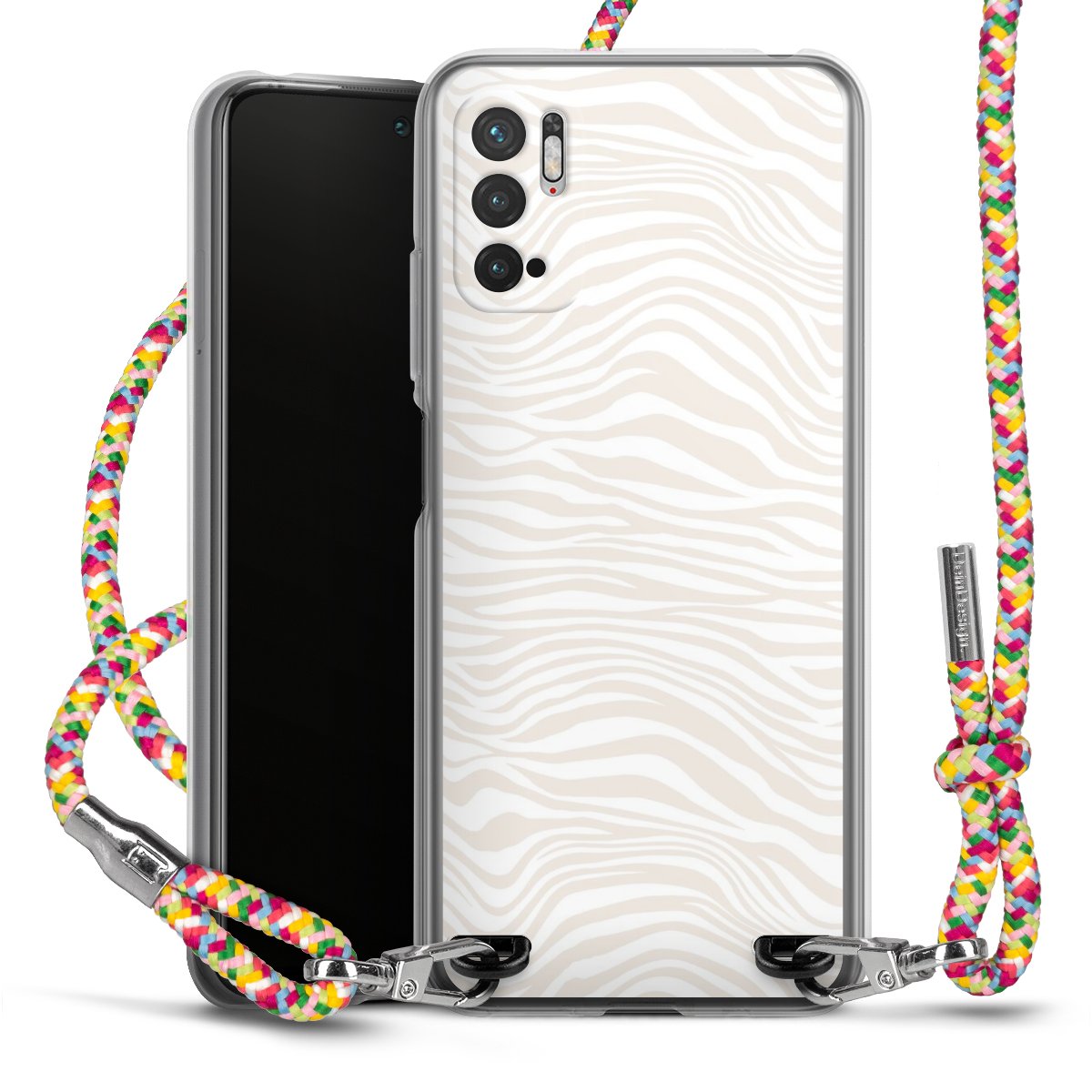 The flexible case is made from a highquality TPU material (thermoplastic Polyurethan). Thanks to its longlasting and break resistant characterisitcs, the case is flexible yet consistent in form and has a great grip and feel. The textile strap made from Polyester gives a chic yet casual accent allowing you to carry your phone like a bag or necklace - a practical gadget perfect for your next adventure. The textile strap is about 1.70 meters long and the length can easily be adjusted through the knots. Our Carry Case is available in Colourful, Mint-Camouflage, Very-Berry, Sahara-Sand and Sparkling-Neon. The ends of the textile strap are covered with metallic end caps to protect them against fraying.