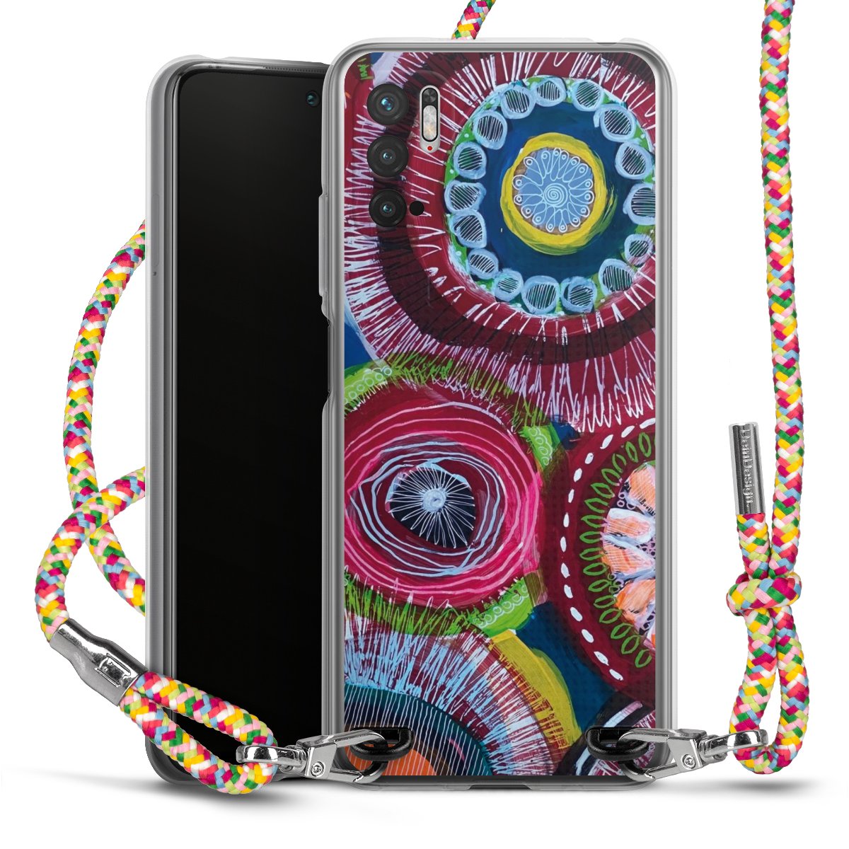 The flexible case is made from a highquality TPU material (thermoplastic Polyurethan). Thanks to its longlasting and break resistant characterisitcs, the case is flexible yet consistent in form and has a great grip and feel. The textile strap made from Polyester gives a chic yet casual accent allowing you to carry your phone like a bag or necklace - a practical gadget perfect for your next adventure. The textile strap is about 1.70 meters long and the length can easily be adjusted through the knots. Our Carry Case is available in Colourful, Mint-Camouflage, Very-Berry, Sahara-Sand and Sparkling-Neon. The ends of the textile strap are covered with metallic end caps to protect them against fraying.