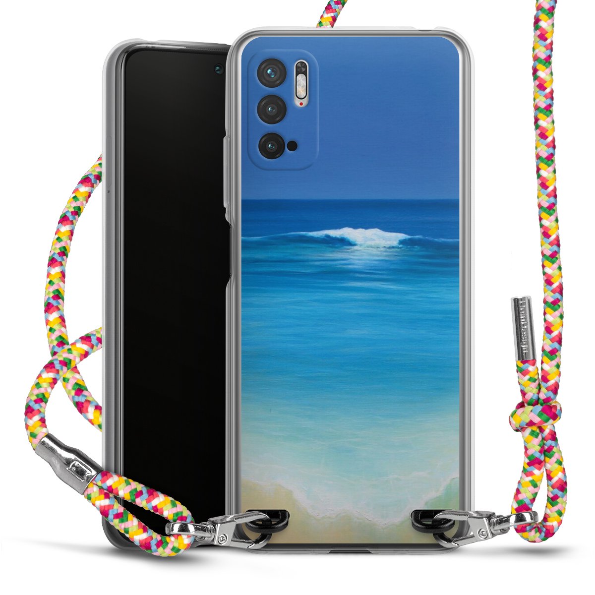 The flexible case is made from a highquality TPU material (thermoplastic Polyurethan). Thanks to its longlasting and break resistant characterisitcs, the case is flexible yet consistent in form and has a great grip and feel. The textile strap made from Polyester gives a chic yet casual accent allowing you to carry your phone like a bag or necklace - a practical gadget perfect for your next adventure. The textile strap is about 1.70 meters long and the length can easily be adjusted through the knots. Our Carry Case is available in Colourful, Mint-Camouflage, Very-Berry, Sahara-Sand and Sparkling-Neon. The ends of the textile strap are covered with metallic end caps to protect them against fraying.