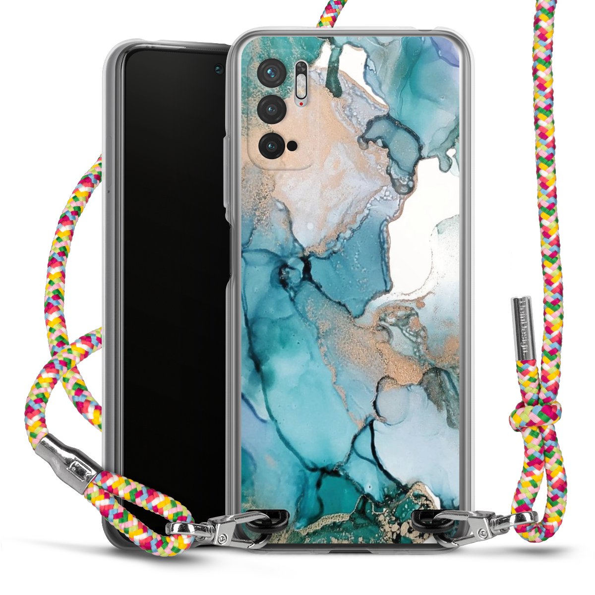 The flexible case is made from a highquality TPU material (thermoplastic Polyurethan). Thanks to its longlasting and break resistant characterisitcs, the case is flexible yet consistent in form and has a great grip and feel. The textile strap made from Polyester gives a chic yet casual accent allowing you to carry your phone like a bag or necklace - a practical gadget perfect for your next adventure. The textile strap is about 1.70 meters long and the length can easily be adjusted through the knots. Our Carry Case is available in Colourful, Mint-Camouflage, Very-Berry, Sahara-Sand and Sparkling-Neon. The ends of the textile strap are covered with metallic end caps to protect them against fraying.