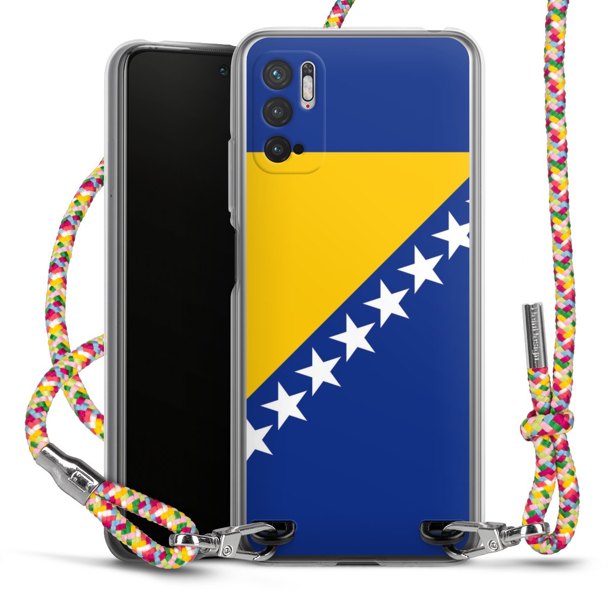 The flexible case is made from a highquality TPU material (thermoplastic Polyurethan). Thanks to its longlasting and break resistant characterisitcs, the case is flexible yet consistent in form and has a great grip and feel. The textile strap made from Polyester gives a chic yet casual accent allowing you to carry your phone like a bag or necklace - a practical gadget perfect for your next adventure. The textile strap is about 1.70 meters long and the length can easily be adjusted through the knots. Our Carry Case is available in Colourful, Mint-Camouflage, Very-Berry, Sahara-Sand and Sparkling-Neon. The ends of the textile strap are covered with metallic end caps to protect them against fraying.