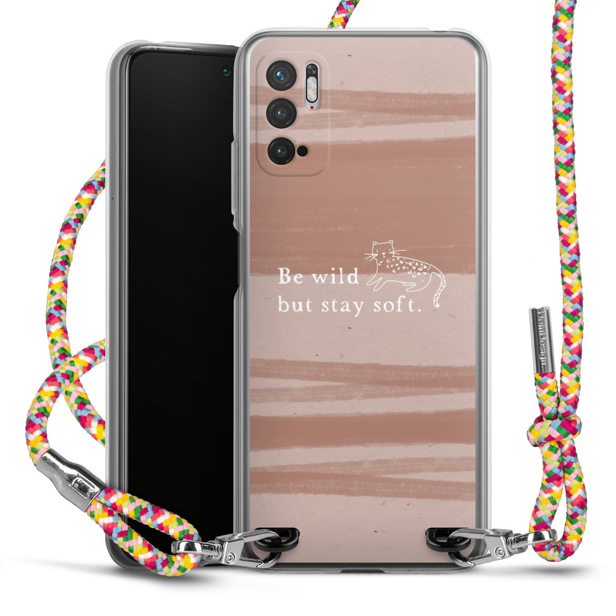 The flexible case is made from a highquality TPU material (thermoplastic Polyurethan). Thanks to its longlasting and break resistant characterisitcs, the case is flexible yet consistent in form and has a great grip and feel. The textile strap made from Polyester gives a chic yet casual accent allowing you to carry your phone like a bag or necklace - a practical gadget perfect for your next adventure. The textile strap is about 1.70 meters long and the length can easily be adjusted through the knots. Our Carry Case is available in Colourful, Mint-Camouflage, Very-Berry, Sahara-Sand and Sparkling-Neon. The ends of the textile strap are covered with metallic end caps to protect them against fraying.