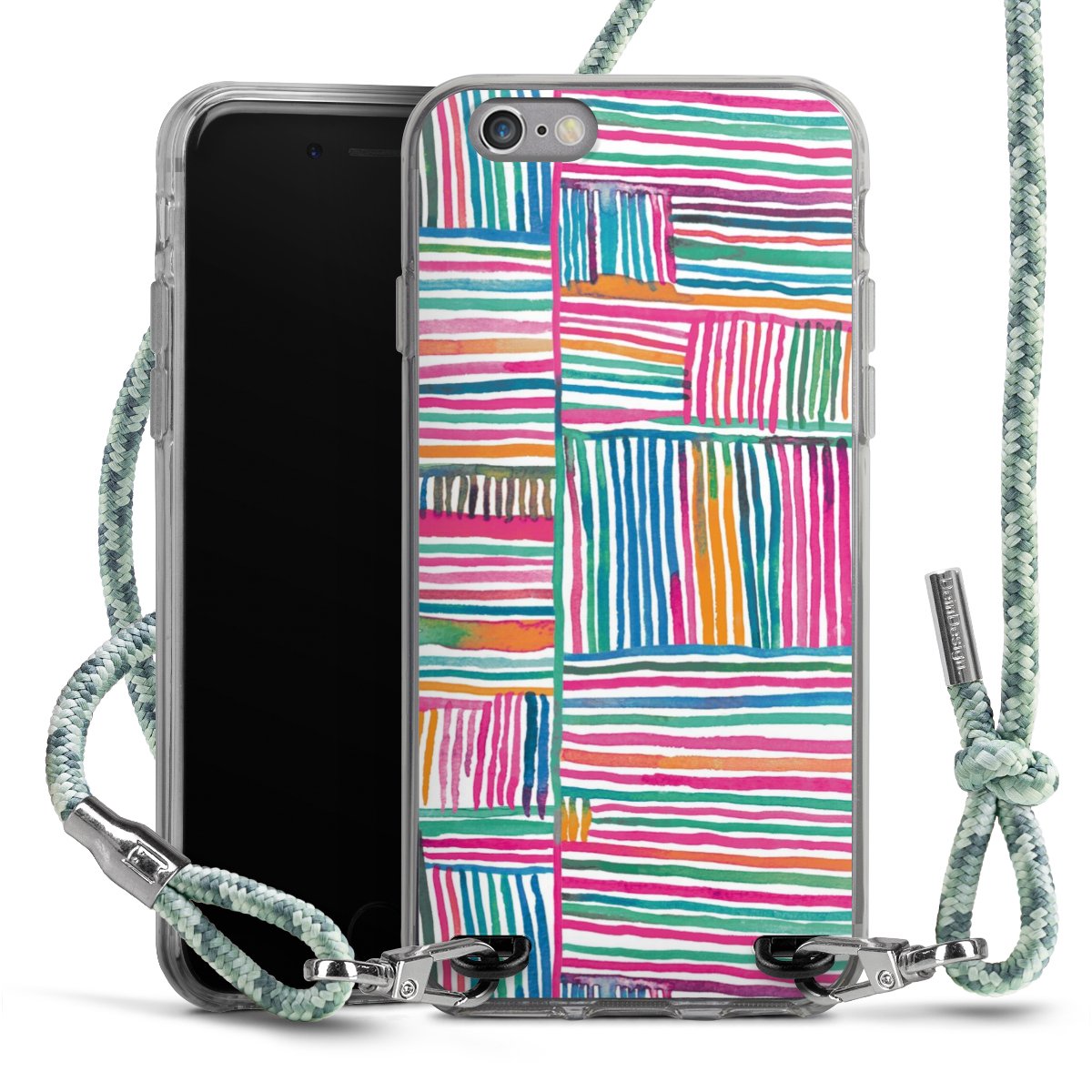 The flexible case is made from a highquality TPU material (thermoplastic Polyurethan). Thanks to its longlasting and break resistant characterisitcs, the case is flexible yet consistent in form and has a great grip and feel. The textile strap made from Polyester gives a chic yet casual accent allowing you to carry your phone like a bag or necklace - a practical gadget perfect for your next adventure. The textile strap is about 1.70 meters long and the length can easily be adjusted through the knots. Our Carry Case is available in Colourful, Mint-Camouflage, Very-Berry, Sahara-Sand and Sparkling-Neon. The ends of the textile strap are covered with metallic end caps to protect them against fraying.
