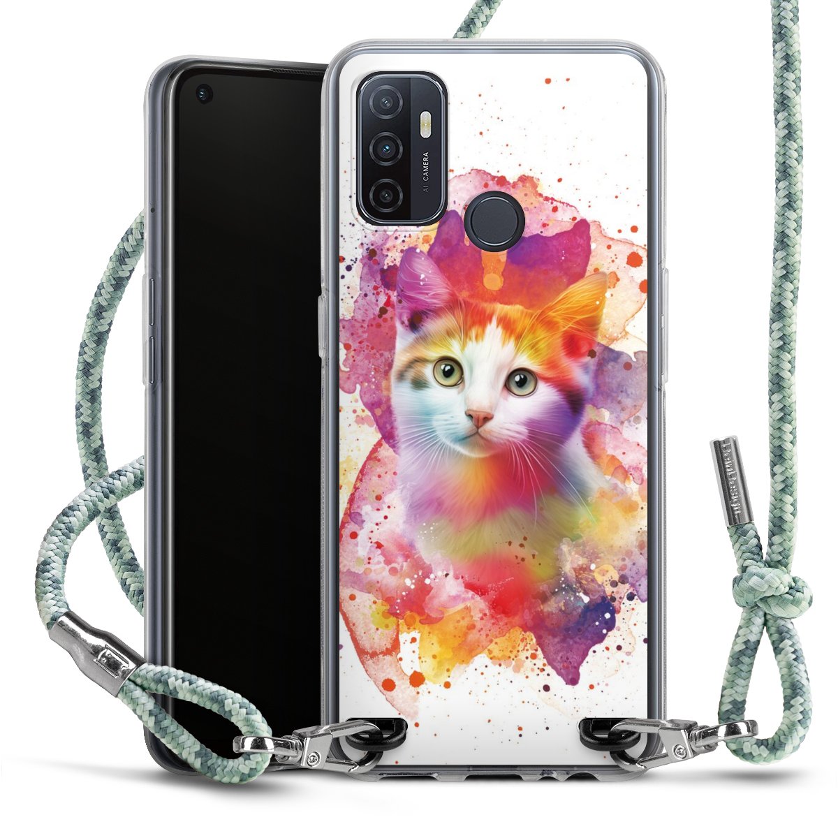 The flexible case is made from a highquality TPU material (thermoplastic Polyurethan). Thanks to its longlasting and break resistant characterisitcs, the case is flexible yet consistent in form and has a great grip and feel. The textile strap made from Polyester gives a chic yet casual accent allowing you to carry your phone like a bag or necklace - a practical gadget perfect for your next adventure. The textile strap is about 1.70 meters long and the length can easily be adjusted through the knots. Our Carry Case is available in Colourful, Mint-Camouflage, Very-Berry, Sahara-Sand and Sparkling-Neon. The ends of the textile strap are covered with metallic end caps to protect them against fraying.