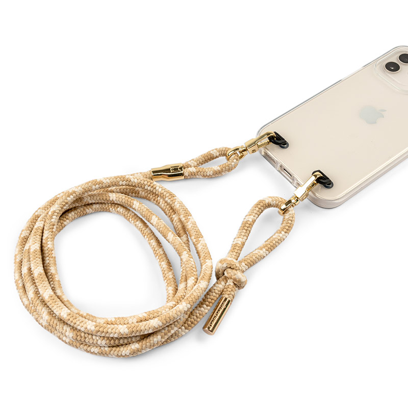 The flexible case is made from a highquality TPU material (thermoplastic Polyurethan). Thanks to its longlasting and break resistant characterisitcs, the case is flexible yet consistent in form and has a great grip and feel. The textile strap made from Polyester gives a chic yet casual accent allowing you to carry your phone like a bag or necklace - a practical gadget perfect for your next adventure. The textile strap is about 1.70 meters long and the length can easily be adjusted through the knots. Our Carry Case is available in Colourful, Mint-Camouflage, Very-Berry, Sahara-Sand and Sparkling-Neon. The ends of the textile strap are covered with metallic end caps to protect them against fraying.