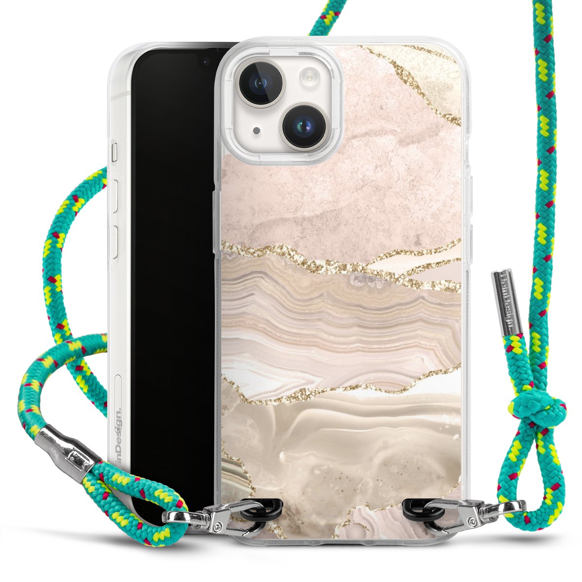 The flexible case is made from a highquality TPU material (thermoplastic Polyurethan). Thanks to its longlasting and break resistant characterisitcs, the case is flexible yet consistent in form and has a great grip and feel. The textile strap made from Polyester gives a chic yet casual accent allowing you to carry your phone like a bag or necklace - a practical gadget perfect for your next adventure. The textile strap is about 1.70 meters long and the length can easily be adjusted through the knots. Our Carry Case is available in Colourful, Mint-Camouflage, Very-Berry, Sahara-Sand and Sparkling-Neon. The ends of the textile strap are covered with metallic end caps to protect them against fraying.