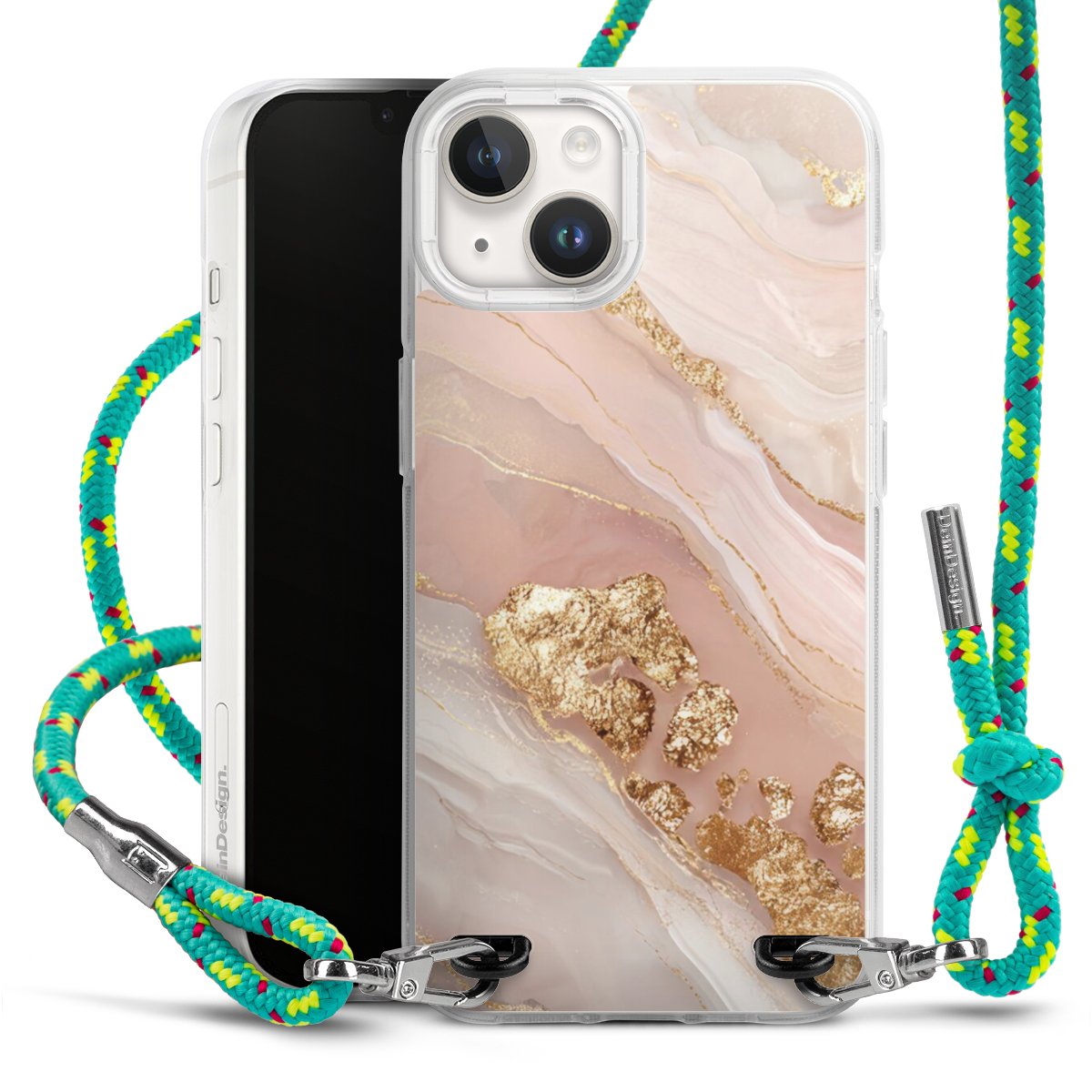 The flexible case is made from a highquality TPU material (thermoplastic Polyurethan). Thanks to its longlasting and break resistant characterisitcs, the case is flexible yet consistent in form and has a great grip and feel. The textile strap made from Polyester gives a chic yet casual accent allowing you to carry your phone like a bag or necklace - a practical gadget perfect for your next adventure. The textile strap is about 1.70 meters long and the length can easily be adjusted through the knots. Our Carry Case is available in Colourful, Mint-Camouflage, Very-Berry, Sahara-Sand and Sparkling-Neon. The ends of the textile strap are covered with metallic end caps to protect them against fraying.
